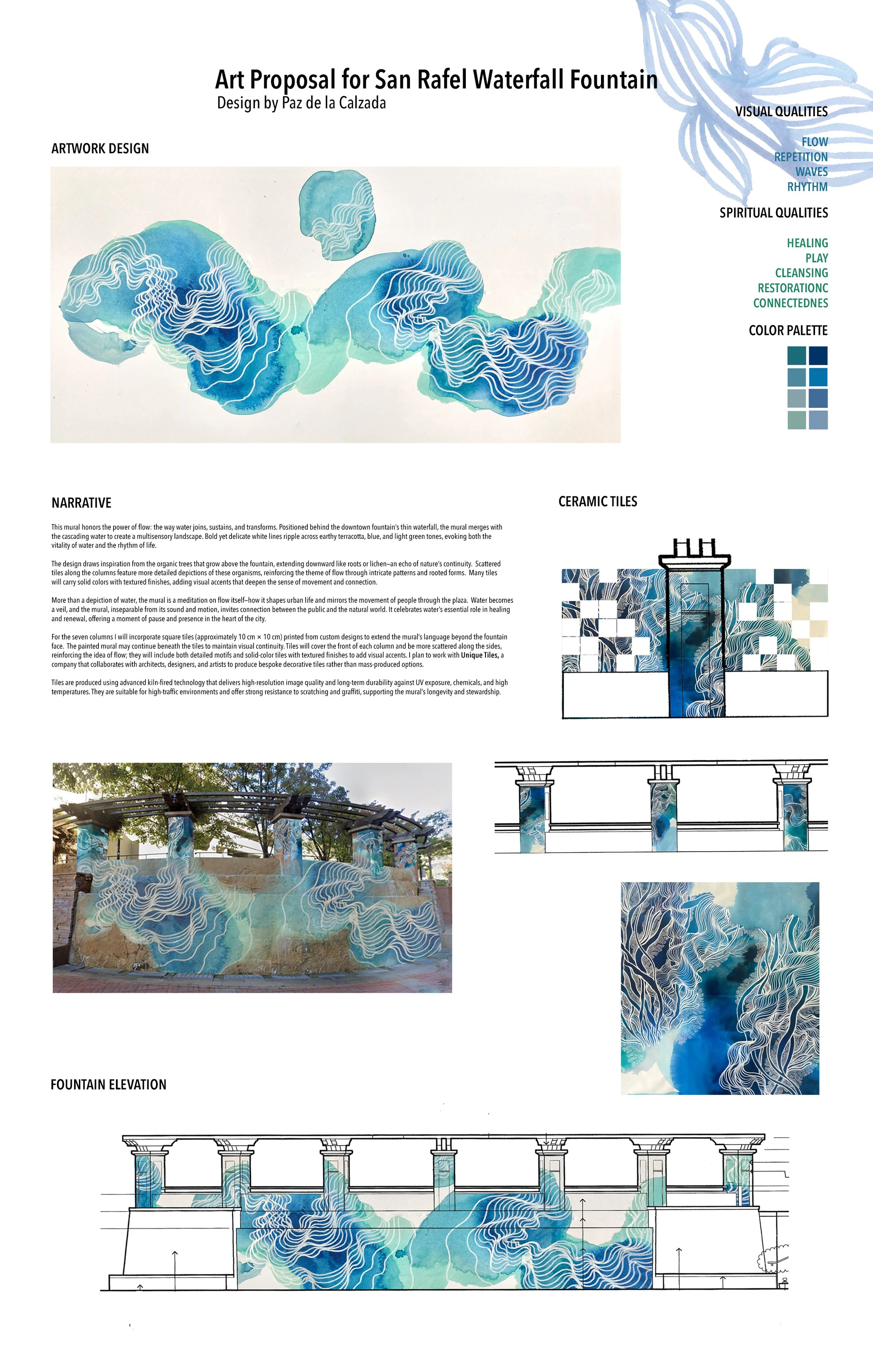 For the seven columns I will incorporate square tiles (approximately 10cmx10cm) printed from custom designs to extend the mural’s language beyond the fountain face. The painted mural may continue beneath the tiles to maintain visual continuity. Tiles will cover the front of each column and be more scattered along the sides, reinforcing the idea of flow; they will include both detailed motifs and solid-color tiles with textured finishes to add visual accents. I plan to work with Unique Tiles, a company that collaborates with architects, designers, and artists to produce bespoke decorative tiles rather than mass produced options.