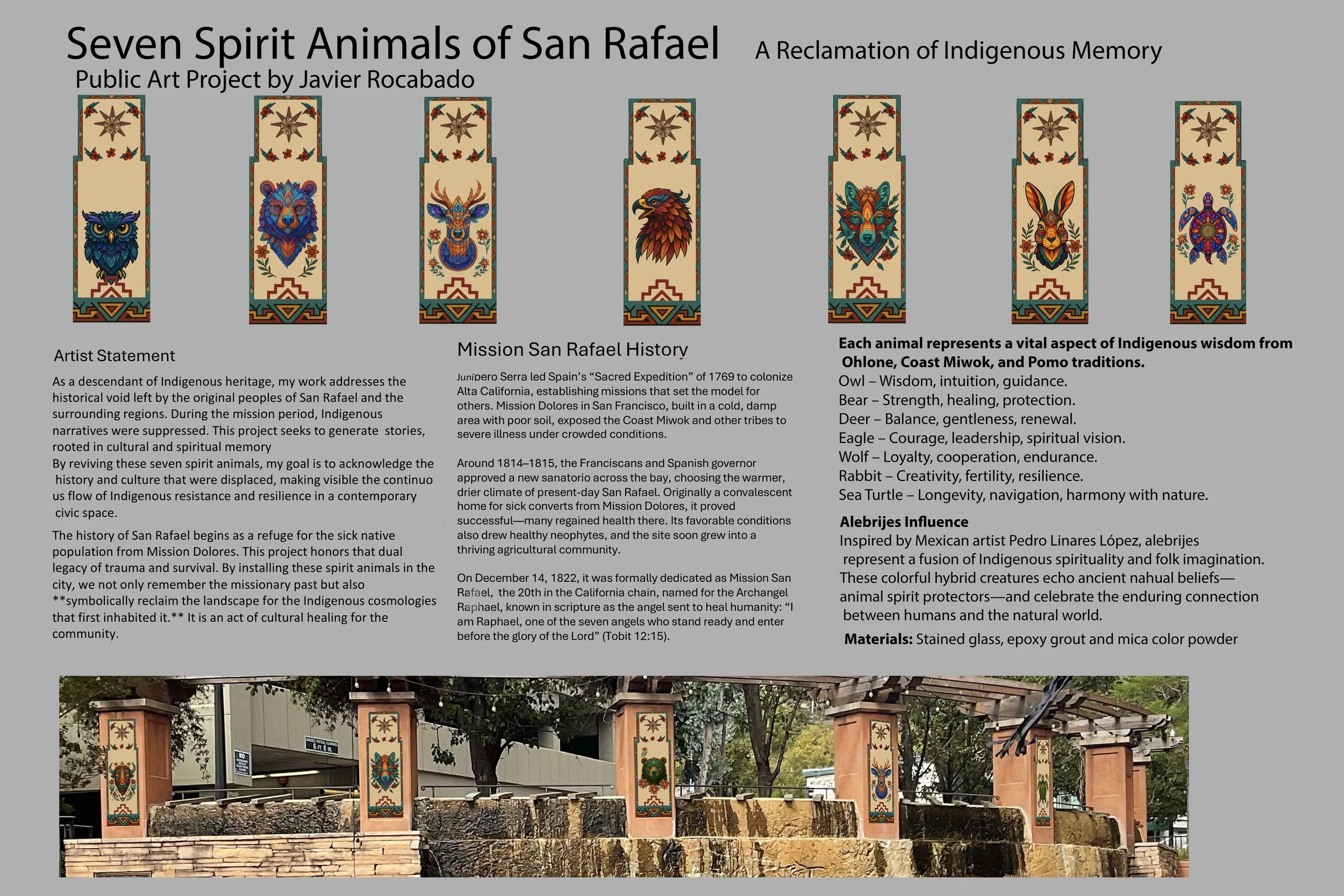 The history of San Rafael begins as a refuge for the sick native population from Mission Dolores. This project honors that dual legacy of trauma and survival. By installing these spirit animals in the city, we not only remember the missionary past but also **symbolically reclaim the landscape for the indigenous cosmologies that first inhabited it. ** It is an act of cultural healing for the community.